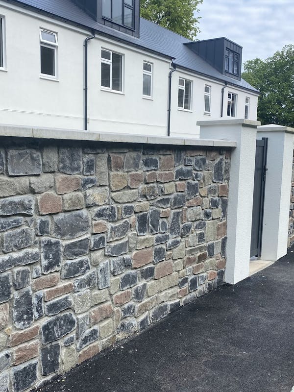 A blend of stones was required to create the look of the traditional stone walls found all over Torbay as the Old Stonycombe quarry is no longer providing walling stone, hence ‘Torbaydos blend’ was born. But the new walling also hides a more environmental approach to stone traditional stone walling as real stone slips are used in place of larger pieces of stone. This has two main advantages, firstly it uses a fraction of the stone as the slips (typically 1.5/3cm thick) are just used to face the wall and secondly the wall can be laid in a fraction of the time without the need of a skilled stonemason. The finished product is in keeping with tradition and will last just as long as a traditional stone wall.