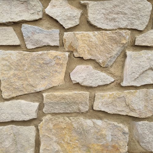 A classic, cream/buff limestone with tints of ochre and yellow. A hard natural limestone for building and walling; tumbling gives it a softer, weathered appearance. The rubble build style consists of irregular shaped stones of random sizes.